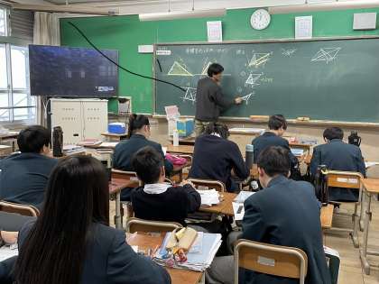 2年生の数学の授業では、「等積変形」を利用して図形の問題を解く方法について学習しました。(写真中)