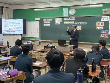京都府警OBのスクールサポーターの方を講師にお迎えし、「薬物乱用防止教室」をクラス毎に行いました。薬物の怖さについてのお話を真剣な表情で聴く生徒の姿がとても印象的でした。