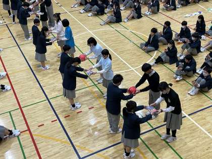 プレゼント贈呈では、学級ボールとマーカーセットをもらいました。明日からの昼休みが楽しみです。