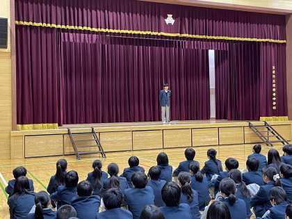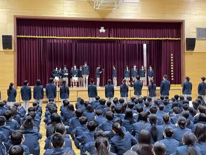 前期学級役員の認証式を行いました。生徒会本部役員の生徒から学級役員に選ばれた代表生徒に認証状が渡されると、会場からは大きな拍手が贈られました。