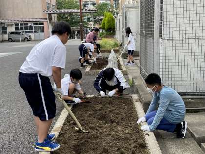 仲間で協力して雑草を抜いて土を耕しました。今年はメンバーが多いので、みんなで取り組めば作業は能率よく進みます。
