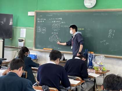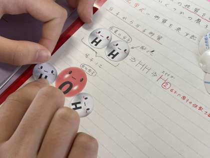 2年生の理科の授業では、「分子からなる物質」について学習しています。本時は、「原子」のシールを使って、それらが結びついて「水素」「酸素」「二酸化炭素」「水」などの分子を作っていることをイメージしながら、楽しく学習を進めました。