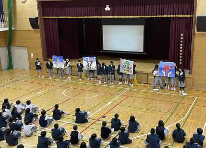 1年生は、5月15日(水)5限に学年集会を行いました。各クラスの評議員と学級旗の制作者から学級目標と学級旗の発表がありました。