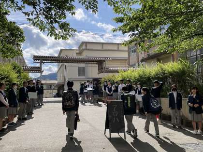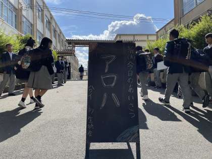 安祥寺中学校では、生徒会の取組として朝の「あいさつ運動」で、日本各地の方言や世界の言葉で「おはよう」を言う企画を行っています。