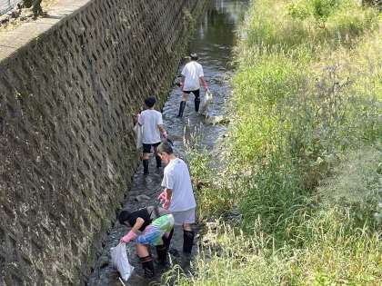 長靴にゴム手袋をして、普段は入れない川に梯子で降りてゴミ拾いをしました。生徒たちは、安祥寺川の自然に触れ、楽しみながら清掃に取り組みました。