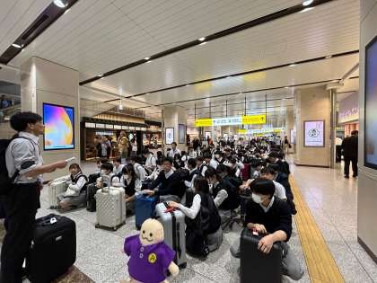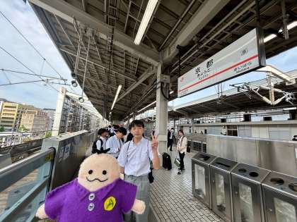 京都駅では、コンコースでいったん整列してからホームに上がり、新幹線の到着を待っています。