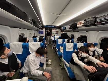 間もなく新幹線が博多に到着します。生活委員長の指示で下車準備をしています。