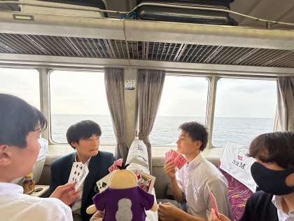 船旅は意外に快適です。ジェットフォイルは揺れも少ないので船酔いの心配もありません。友達とトランプを楽しんだり、窓から海を眺めたり、それぞれが思い思いの船旅を楽しんでいます。
