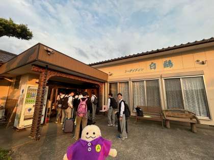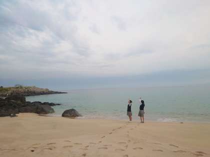 女子の宿舎では、夕食前にビーチに出て写真撮影(写真下)。目の前には綺麗な海が広がります。