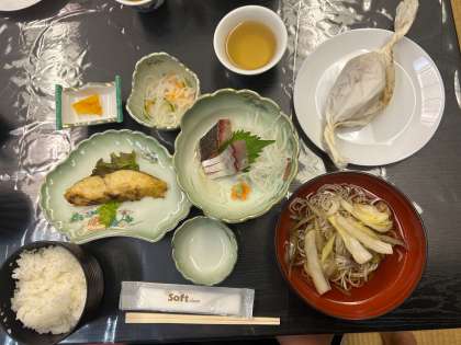 宿の方にも感謝を伝え、「おてての、しわと、しわを、重ねて、幸せ!いただきます!」の掛け声と共に最後のご飯を味わっています。