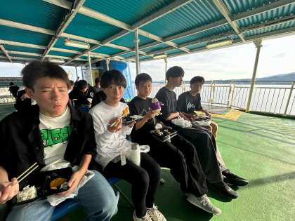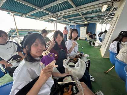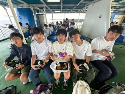 行きのジェットフォイルとは違い、フェリーではゆったりと時間が流れます。船内で朝食のお弁当を食べた後と、それぞれ思い思いの時間を過ごしながら2時間の船旅を楽しんでいます。