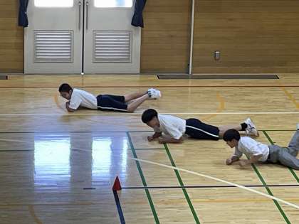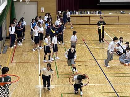 「クラス全員リレー」では、フラフープ、ほふく前進、片足飛び、バックステップ、サイドステップ、なぞなぞ、借り物…とそれぞれが様々な課題をこなしながらクラス全員でタスキをつないでいきました。