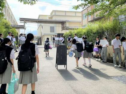 生徒会主催の朝の「あいさつ運動」。