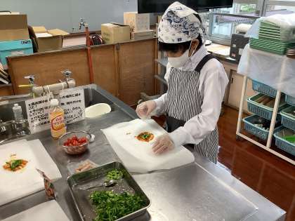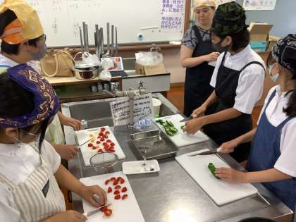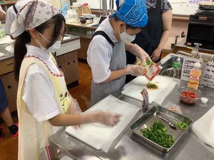 5・6組は、餃子の皮を使ってミニピザを作りました。ピザに乗せる使う具材は、トマト、ピーマン、ベーコン、チーズに、5・6組が栽培した枝豆も加えました。各自が好きな具材を選んでトッピングして、フライパンで焼きました。