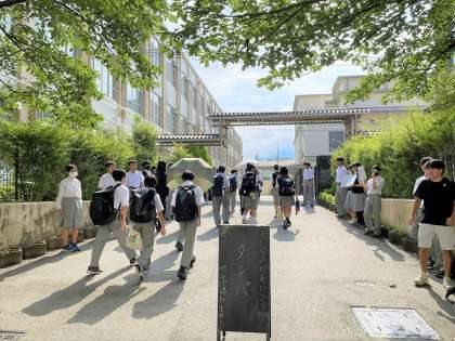 1学期最後の生徒会主催の朝の「あいさつ運動」、世界の言葉で「おはよう」。