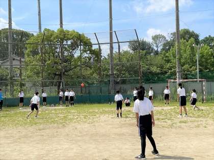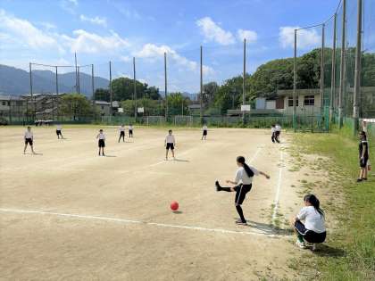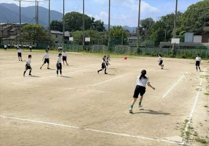 女子はグランドでキックベースをしました。ベースボール型の球技はルールが難しいけれど、みんなで確認しながら楽しく試合ができました。
