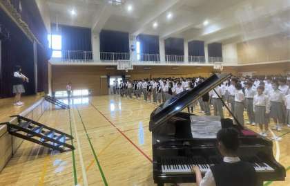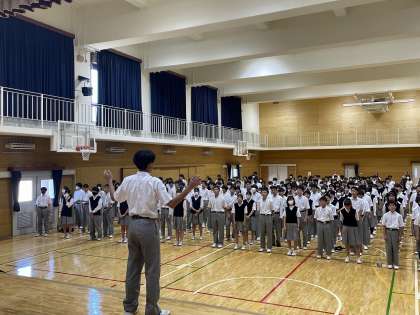 終業式の中で全校生徒で歌った校歌と安祥寺中学校記念応援ソングの「step by step]は、一体感のある歌声でした。