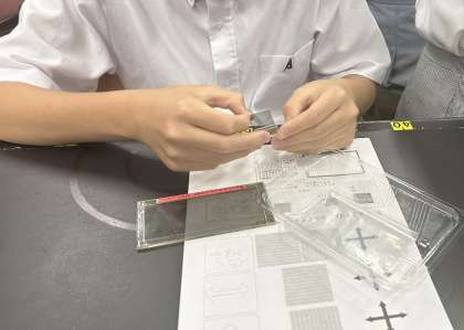 実験室学習では、「ひかりのひみつ」というテーマで、懐中電灯を使って光の道筋を観察したり、偏光板を使って光がどのように進むのかを調べました。自分で作った「偏光板ステンドグラス」は今日の体験の思い出になる良いお土産になりました。