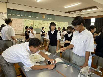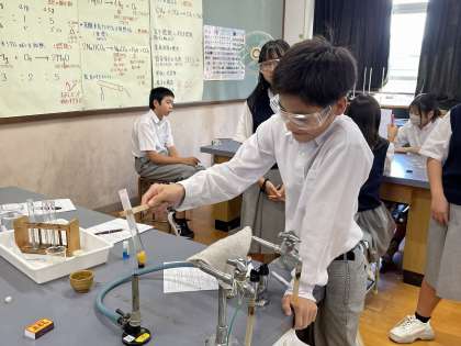 2年生の理科の授業では、デンプンに対するだ液のはたらきについて実験を行い調べました。水にだ液を入れたものと入れていない試験管に、ヨウ素液とベネジクト液をそれぞれ加え、反応(色の変化)を観察しました。