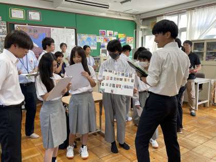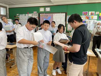 参観に来ていただいた先生方を外国人観光客に見立て、出身国や好きな日本食、日本のアニメなどについて質問ボードを使って質問し、お礼に和紙で折った折り紙をプレゼントしました。生徒たちは、緊張しながらもグループで協力してインタービューを進め、回を重ねるごとにうまくできるようになっていきました。