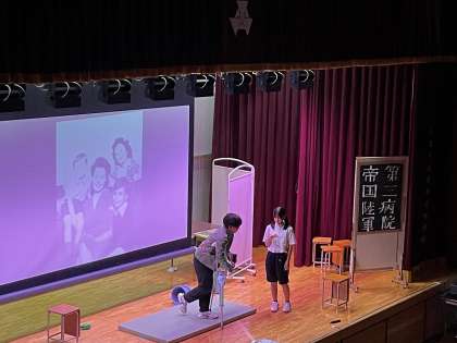 この劇は、大刀洗飛行場が舞台になっていて、特攻隊員の若者、特攻隊員が最後の食事をする軍事定食屋の女将さん、陸軍病院で働く女学生たちが登場します。登場人物の複雑な心情をうまく表現した名演技に思わず涙がこぼれそうになりました。観客として参加した1・2年生、3年生の保護者の皆様、会場にいたすべての人が平和について改めて考えさせられた見事な発表(劇)でした。