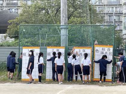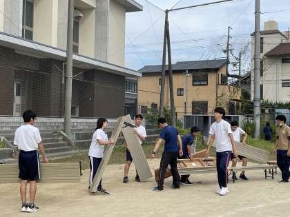 明日10月16日(水)の体育大会に向けて、放課後に生徒会と委員会、関係の部活動の生徒で準備を行いました。
