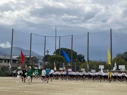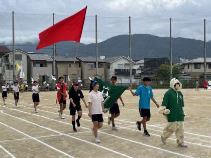 創立50周年記念キャラクターのアンショウオ君を先頭に、生徒会本部、各色の団長、各クラスの学級旗を持った体育委員が続き、体育委員長の笛の音に合わせた元気な入場行進で体育大会が始まりました。