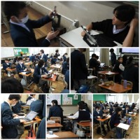 1年生の家庭科の授業では、着なくなったTシャツを使ってエコバッグを制作しています。前時までにボタンとスナップを付け終わって、本時はミシンを使って取っ手を縫い付けました。授業の最後には、GIGA端末で作品の写真を撮って作業の進捗を記録しました。完成が楽しみです。