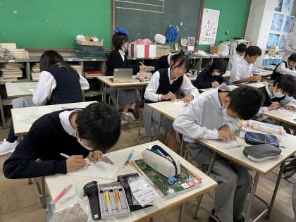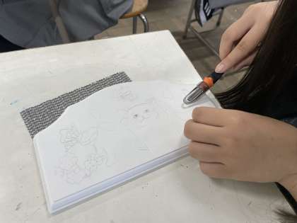 1年生の美術の授業では、白彫板を彫刻刀で彫って絵の具で彩色し、壁掛けを制作しています。動物や植物、乗り物など、動きが感じられるモチーフで、それぞれの個性あふれる作品からは、作者の思いが伝わってきます。自分の家に飾れる素晴らしい作品が出来上がるのが楽しみです。