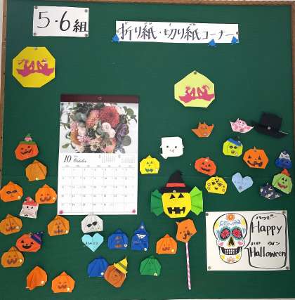 今日は、ハロウィンです。5・6組の生徒が折り紙で作ったハロウィンの飾りが教室前に飾られています。