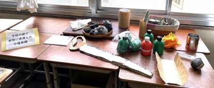 3年生の社会科と総合的な学習の時間では、修学旅行の平和学習・学習発表会に関する展示をしています。劇で使用した大道具も展示してあり、劇や取組の様子の動画も放映しています。