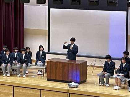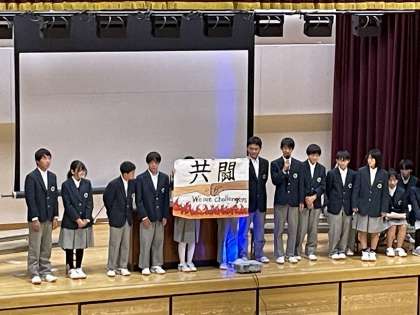 第53期 新生徒会のスローガンは「共闘」。これまでの安祥寺中学校の先輩たちが築いてきた歴史や思いを受け継いで、新しい安祥寺中学校作っていくために、全校生徒みんなで心を一つにして共に頑張っていこうという思いが込められています。
