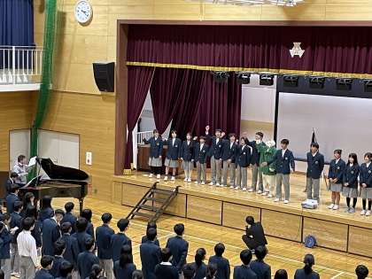 校歌と安祥寺中学校50周年記念ソングの『step by step』を全校生徒で元気よく歌いました。