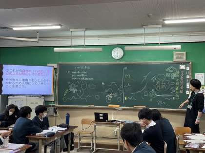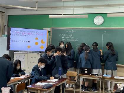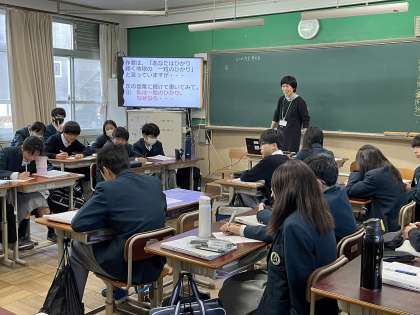 1年生では、学年の担当教員が4クラスを順番に自分が教える教材をローテーションして回るローテーション道徳を行っています。