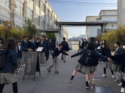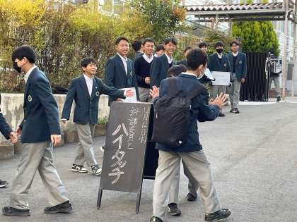 元気よくハイタッチして行く生徒、恥ずかしそうにタッチしていく生徒といろいろな反応がありましたが、参加した生徒会本部や評議員の生徒からは「なんか朝から楽しい!}という声があがっていました。今朝は一段と冷え込む寒い朝となりましたが、朝からみんなの笑顔があふれ心温まるひと時でした。