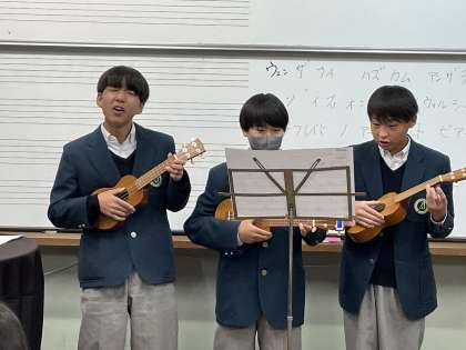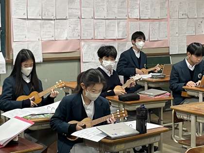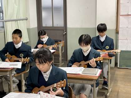 1年生の音楽の授業では、ウクレレの演奏に取り組んでいます。曲目は、1980年代のアメリカ合衆国の青春ドラマ映画の主題歌「Stand by Me」です。みんなで楽しく練習に取り組んでいます。