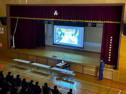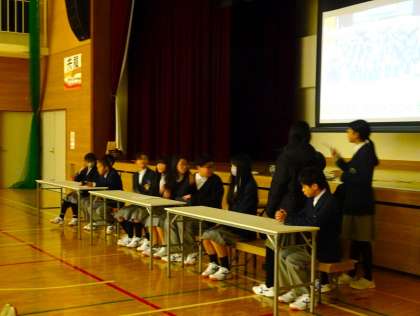 1年生の学年集会では、校外学習、委員会活動、クラスの振り返りについて、それぞれ生徒たちが発表をしました。