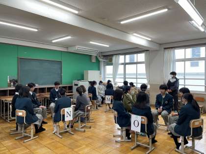「生き方探究チャレンジ体験(職場体験)」の経験をもとに「将来の夢・進路・働く事の意義」について考えていることや、社会問題になっているいじめやSNSの問題、ルールや校則について、自分たちの住む町や地域についてなど、いろいろなテーマについて話をしました。