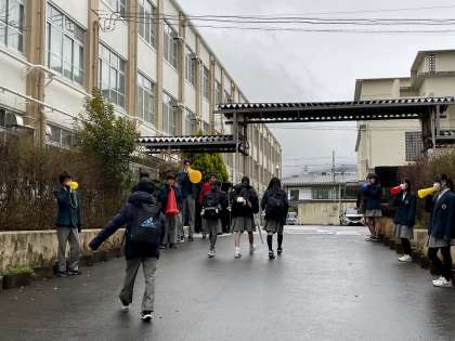 朝のあいさつ運動、火曜日の担当は生活委員会です。生活委員会では、メガホンを使ってのあいさつ運動を行っています。大きなメガホンからの大きな元気なあいさつが聞こえてきます。あいにくの空模様ですが今日も1日元気に頑張れそうです。