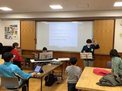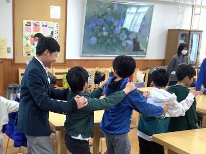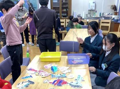 小学生が企画した「魚つり」「じゃんけん列車」「伝言ゲーム」などを楽しみ、最後に中学生の指揮と伴奏で「ありがとうの花」を歌いました。