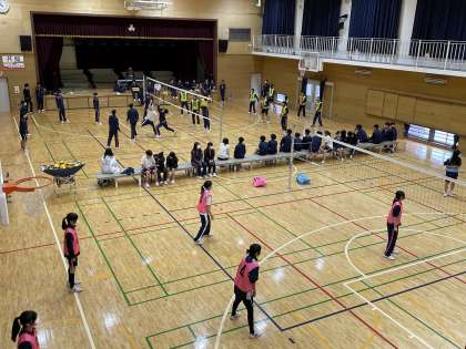 卒業前行事として、3年生は球技大会を行いました。雨天のため、当初に予定していた種目を変更して男女とも体育館でバレーボールをしました。