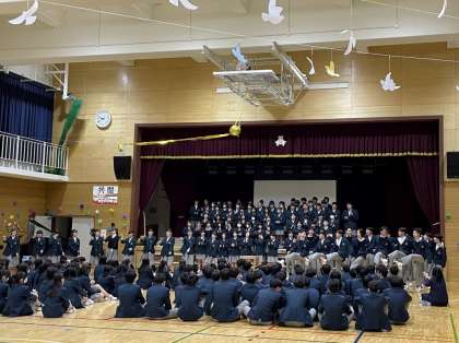 2年生の発表は、群読と合唱「栄光の架け橋」。最後に3年生に向けての応援団によるエールやチアダンス隊によるラインダンスがあり、迫力と楽しさのある発表でした。