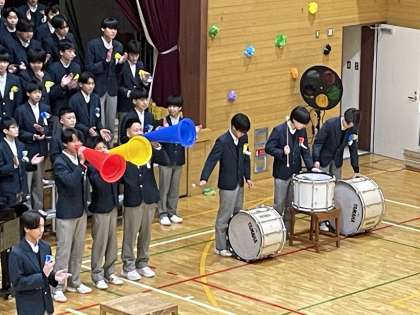3年生の発表は、まずは体育祭の応援団長・副団長による迫力のある応援歌と太鼓から。学園合唱は、「3月9日」と「旅立ちの日に」の2曲を披露してくれました。1・2年生からのメッセージの中に度々出てきメッセージの中に「憧れの存在」という言葉が度々出てきていましたが、まさにその言葉通り、最後にも後輩に素晴らしい姿を見せてくれました。