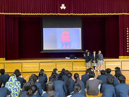 評議員の企画運営で集会は進行され、1年間の振り返り、修学旅行のスローガンとマスコットキャラクターの発表の後、O×クイズ等を楽しみ、学年の振り返り動画を視聴しました。