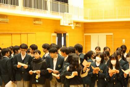 最後に先生方には内緒のサプライズで、学年全員から感謝の思いを込めた歌と生徒からの通知票と感謝状を贈られ、温かい雰囲気に包まれた中で集会は終了しました。