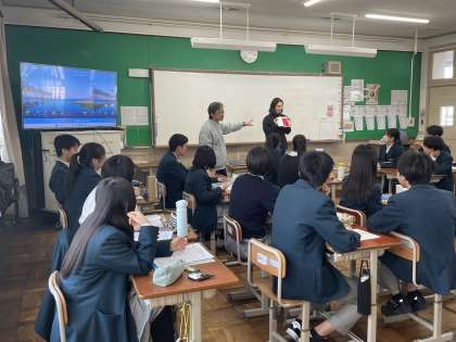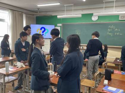 2年生の英語の授業では、ペアワークで日本語やジェスチャーを使わずにすべて英語の会話だけで伝えるクイズを行いました。(写真中)