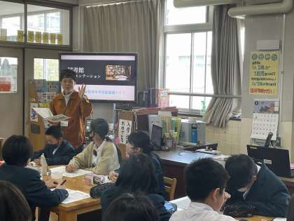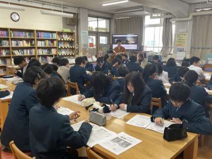 1年生の国語の時間に図書館オリエンテーションを行いました。図書館司書の先生から、図書館の利用の仕方や本の借り方・返し方などの話を聞いて「読書ノート」にメモをとる姿が印象的でした。