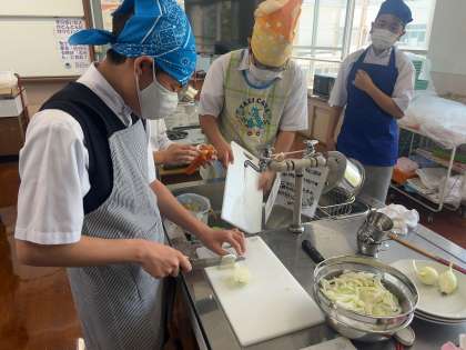 メニューは「オニオンスープ」と「オニオン焼きそば」です。切って、炒めて、煮て、味付けて・・・仲間と協力して安全に気をつけながら楽しく調理作業を進めました。