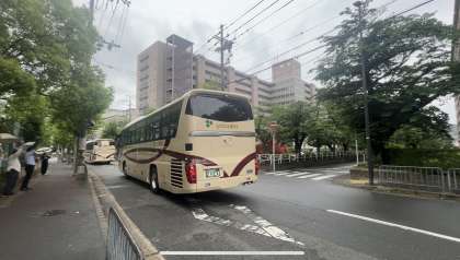 2台のバスに分乗し、ほぼ定刻の7時05分、京都駅に向けてバスが無事出発しました。