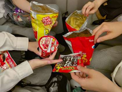 新幹線の車内の様子です。トランプをしたり、おやつを食べたりと、新幹線での旅を楽しんでいます。